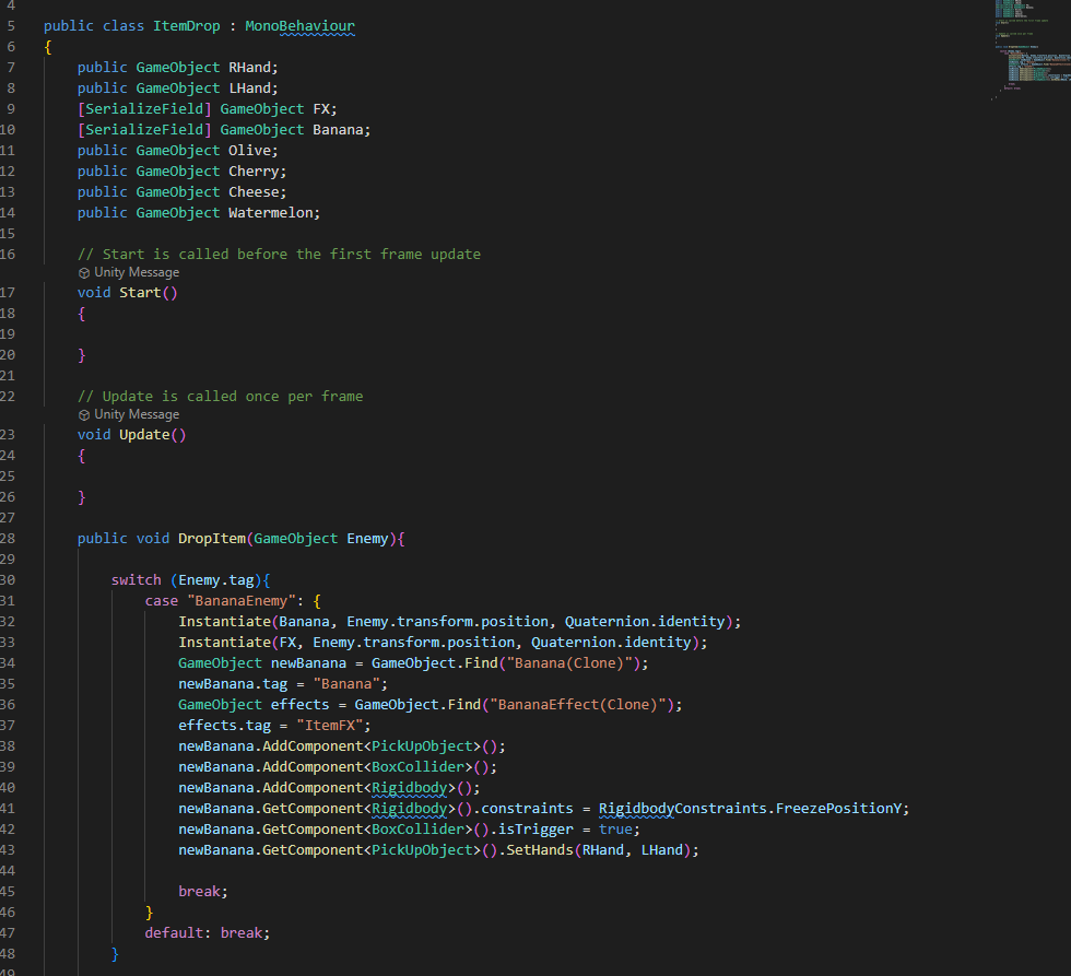 The mechanics in this game were programmed in C# and contain original code. These lines of code drop a banana and emit an effect when a banana monster enemy is defeated.